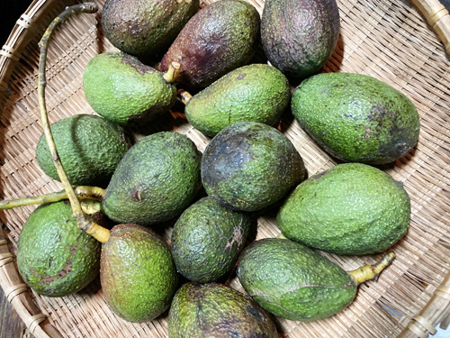 下から見上げると、高枝切バサミが届きそうもない位置に10センチくらいの実が、チラホラと葉の隙間からのぞいています