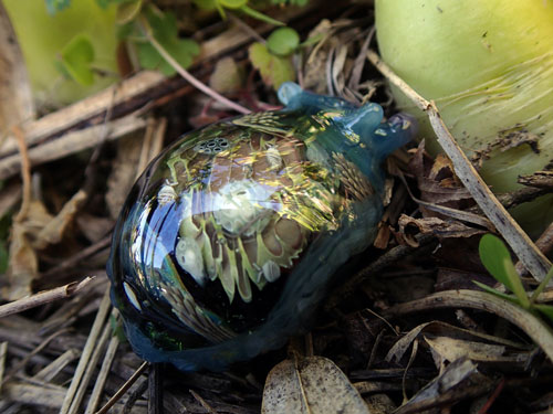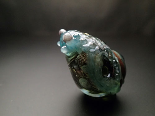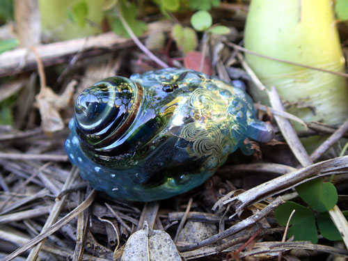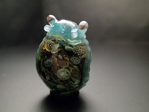 透明や半透明、そして不透明のガラスと銀箔を混ぜ込んだ青緑の軟体部分は、複雑で渋い表情をもっています。