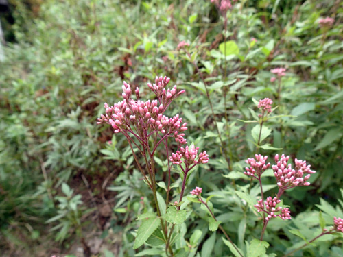 礒やしきの柿の木がある畑まで、坂道を下って、てくてくお散歩です 坂道の途中に群生しているフジバカマは、もう少しで開花です 開花すると、この花の蜜を求めてアサギマダラが、飛来します