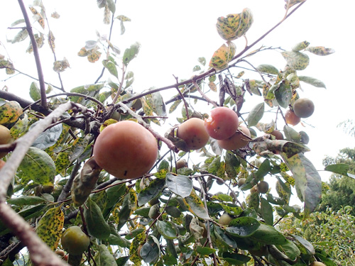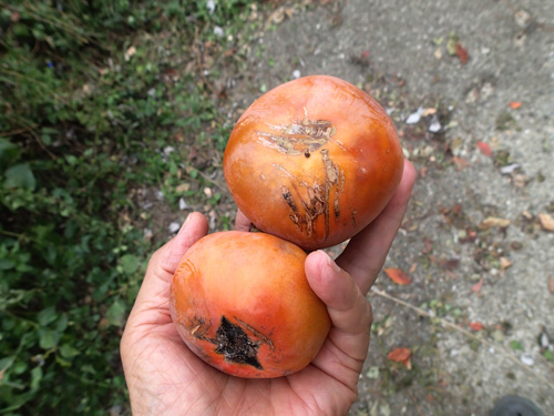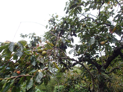 柿は、どの木も実がたくさん付いています 緑色に混じって朱色に熟れた実が、ポツリポツリとありました 柿は、ここに住んでいる、礒野さんはもちろんのこと、鳥さんや、シカさんや、イノシシさん、アナグマさんにタヌキさんにハクビシンさん、そして虫さんたち、みんなのご飯になります これは、誰かがかじろうとしたアトかな 今日の、おやつに食べる分だけいただきましょう