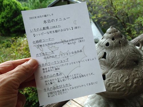 ども、町長です 和歌山の礒やしきに来ております 毎月第二日曜日は、いそのん劇場の開催日です 朝晩は随分と涼しくなりました、フジバカマも開花しはじめました アサギマダラは、そろそろだと思うのですが、まだ来ていないようです 飛んでくるのが待ち遠しいです 礒野さん おはようございます 会場では、礒野さんのはじまり宣言とともに開幕いたします 今日のおすすめメニューがみなさんに手渡され・・・ なになに、「ハッピーな死生観のおはなし」・・・ 今日のいそのん劇場はハロウィンっぽいですよ~