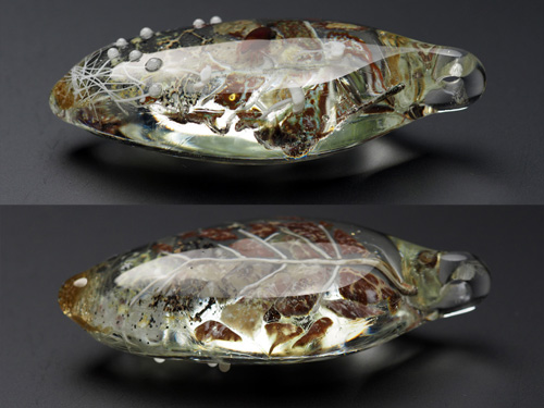 寄生キノコのストローマが、制作時の偶然から青と銀粉を残したつぶつぶのあるものの2つの仕上がりになり、それもあって、特に腹部側からの景色がきれいな個体です。