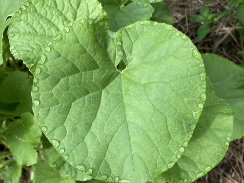 少し前、いそのん劇場のお手伝いに来た時のこと... 礒野さんに、メロンをご馳走になりました とても美味しくいただいた後に、タネを礒やしきの玄関に撒いてきたのですが ナント!芽が出て根が出て開花しておりました 朝になると、夜露の水滴が葉っぱ上に乗っているのですが、 丸い水滴は引力の影響に逆らうように、なぜか葉のフチに綺麗にならんでいるのです う~ん、ビックリですね~